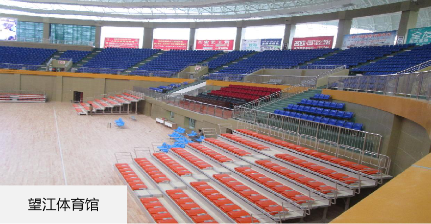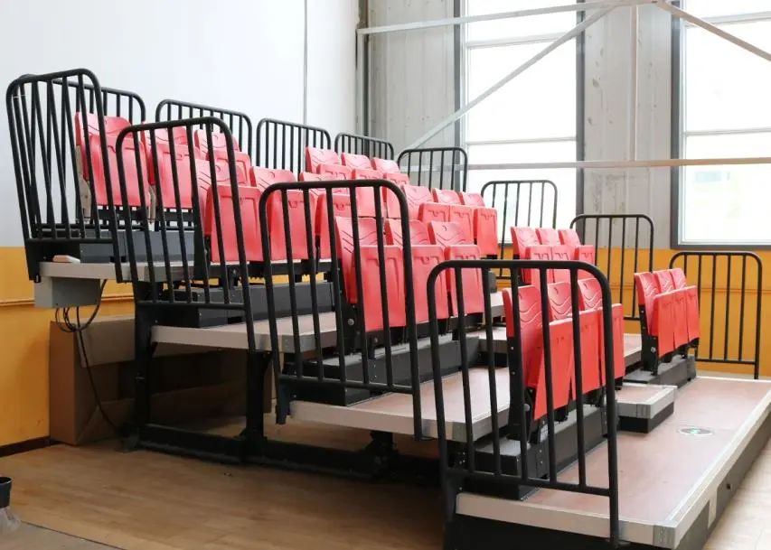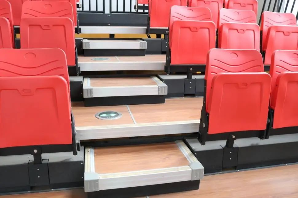 活动看台由座位、踏板、阶梯竖板、可伸缩底部支架组成,具有高度灵活性、安全性和高价值的特点,收拢时占地小,展开时能容纳大量观众。